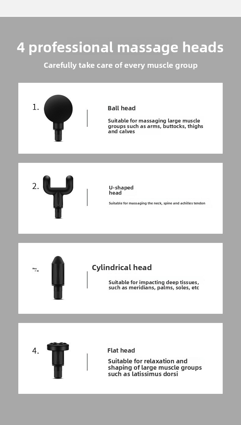 Multiple Attachments: Includes 4 interchangeable massage heads for targeted relief.